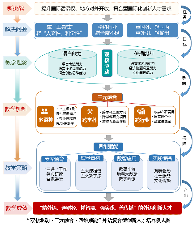 “双核驱动”固根基:强调人才的“工具性、人文性、科学性”相协同,确立“语言能力”与“传播能力”双核心能力群作为人才培养的根本导向与核心目标。
