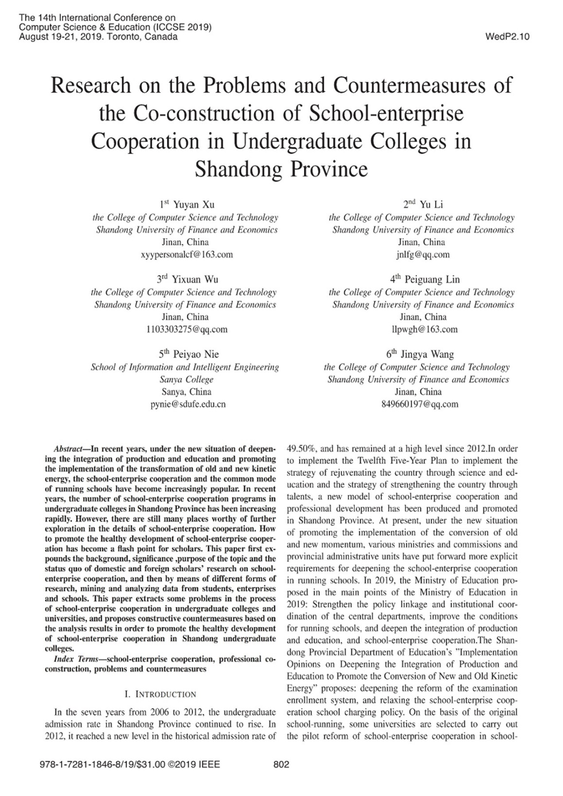 Xu Yuyan, Yu Li, Wu Yixuan, Peiguang Lin, et al. Research on the Problems and Countermeasures of the Co-construction of School-enterprise Cooperation in Undergraduate Colleges in Shandong Province[C]. 2019 14th International Conference on Computer Science & Education (ICCSE). 2019.