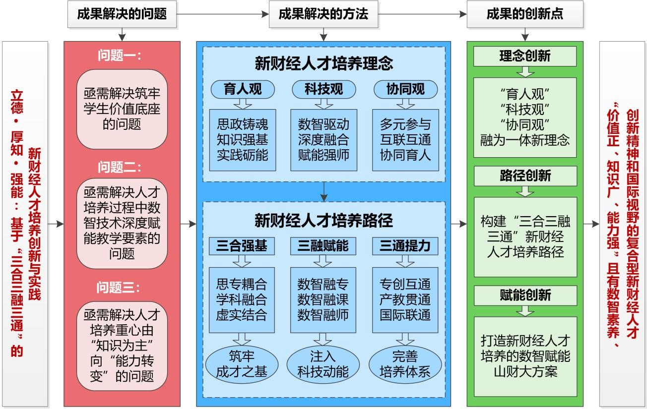 学校主要从四个方面进行创新实践。一是明确内涵。明确“价值引领、学科交叉、数智赋能、全面发展”新财经人才核心内涵。二是重塑理念。重塑“育人观、科技观、协同观”一体化培养理念,即“思政铸魂、知识强基、实践砺能”的育人观,“数智驱动、深度融合、赋能强师”的科技观,“多元参与、互联互通、协同育人”的协同观。三是确立规格。确立“立德、厚知、强能”人才培养规格。四是创建路径。创建实施“三合三融三通”人才培养路径,“三合”筑牢成才根基:通过思专、学科、虚实的深度融合,实现价值塑造、知识传授、能力培养的有机统一;“三融”注入科技动能:通过数智技术赋能专业、课程、师资建设,实现新财经人才培养的数智化转型;“三通”完善培养体系:通过专创互动、产教协同、国际合作等多维融通,将人才培养的输出供给与创新创业、职业发展、国际竞争等现实需求紧密对接,实现学生能力的全面提升。11年来,学校为社会输送7万余名“价值正、知识广、能力强”且具有数智素养、创新精神和国际视野的复合型新财经人才,达到了“立德、厚知、强能”的人才培养要求,成果总体思路见图1。![]()