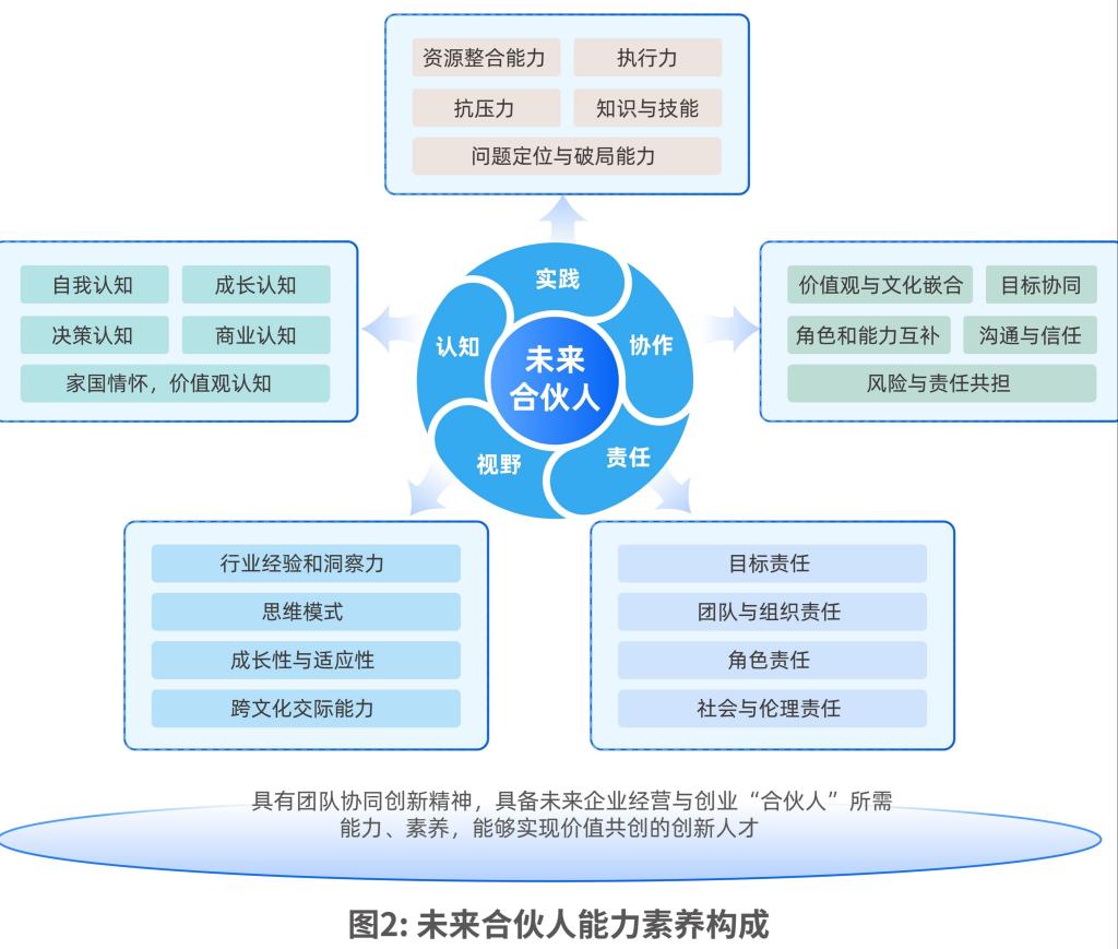 研究确立了“未来合伙人”能力素养构成(图2),专创融合、产教融合、项目驱动,开展双创教育,推动学校教育由知识传授向能力生成、素养培育转型,核心框架涵盖:
