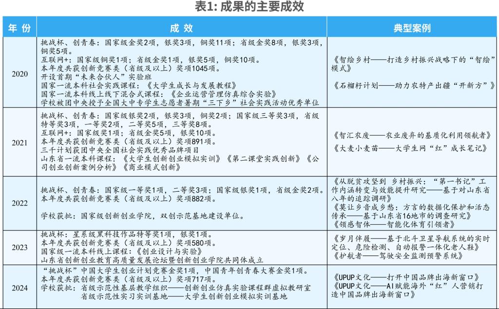 成果成效显著。10年来逾8万名学生完成大一、大二2次“三千计划”社会实践活动和创新创业课程学习与训练;近5年学生获“国创大赛”(互联网+)、“挑战杯”等国奖42项,省奖122项;“三创赛”“市场调查与分析”等学科竞 赛国奖309项、省奖616项;10门双创课程建成3门国家级、4门省级一流课程;获批国家级创新创业学院、山东省双创示范基地建设单位;成果获团省委颁文在全省高校推广,形成了具有示范性的“山财模式”。