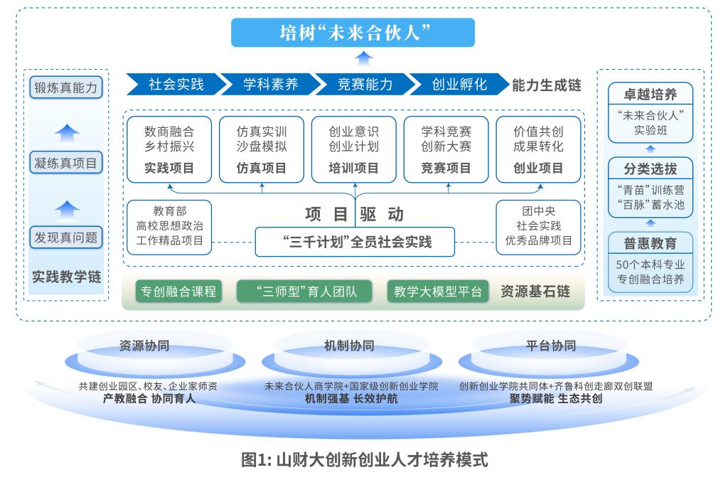 习近平总书记指出“必须在创新实践中发现人才、在创新活动中培育人才”,山东财经大学自2015年起,每年实施“三千计划”社会实践活动(师生进千村、访千企、入千社区),将“实践育人”与“三全育人”深度融合,依托教育部思政工作精品项目等教研课题,10年研究与实践,构建了价值引领,以“培树未来合伙人”为核心理念,项目驱动的“三链耦合、三阶递进、三维协同”创新创业人才培养模式(图1)。