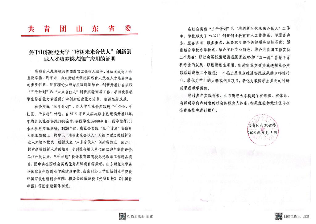 团省委关于山东财经大学“培树未来合伙人”创新创业人才培养模式推广应用的证明