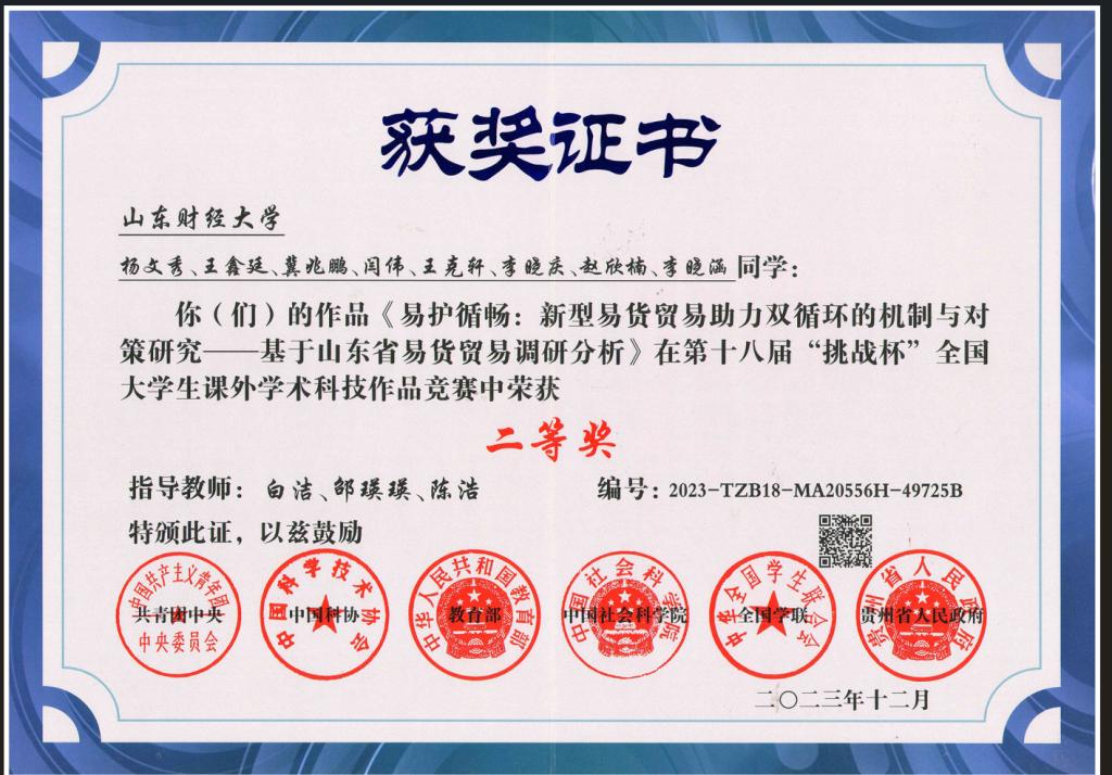 第十八届“挑战杯”全国大学生课外学术科技作品竞赛获二等奖