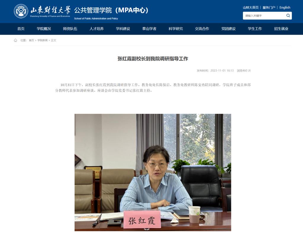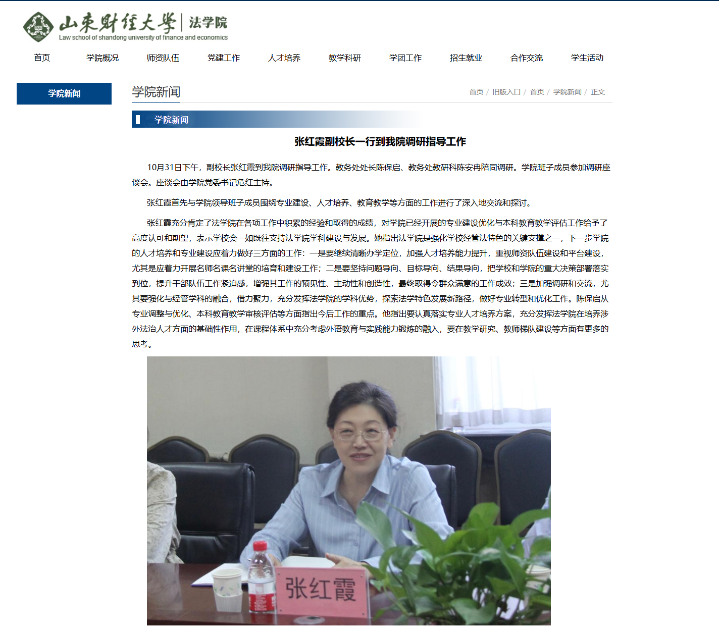 2022年10月31日,副校长张红霞到法学院调研指导工作。她指出法学院是强化学校经管法特色的关键支撑之一,下一步学院的人才培养和专业建设应着力做好三方面的工作:一是要继续清晰办学定位,加强人才培养能力提升,重视师资队伍建设和平台建设,尤其是应着力开展名师名课名讲堂的培育和建设工作;二是要坚持问题导向、目标导向、结果导向,把学校和学院的重大决策部署落实到位,提升干部队伍工作紧迫感,增强其工作的预见性、主动性和创造性,最终取得令群众满意的工作成效;三是加强调研和交流,尤其要强化与经管学科的融合,借力聚力,充分发挥法学院的学科优势,探索法学特色发展新路径,做好专业转型和优化工作。陈保启从专业调整与优化、本科教育教学审核评估等方面指出今后工作的重点。
