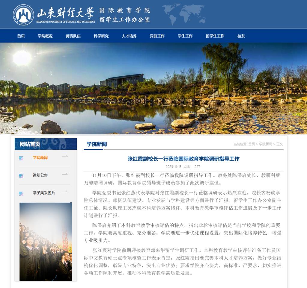 2023年11月10日下午,张红霞副校长一行莅临国际教育学院调研指导工作。张红霞对学院前期迎接教育部来华留学生调研工作、本科教育教学审核评估准备工作及国际中文教育硕士点专项核验工作表示肯定。张红霞指出要完善本科人才培养方案,做好专业结构优化调整,彰显专业特色,突出专业优势;要求学院齐心协力,高标准、严要求,切实推进各项工作顺利开展,推动本科教育教学高质量发展。陈保启介绍了本科教育教学审核评估的特点,指出此轮审核评估是当前学校和学院的重要工作,学院要高度重视、充分准备;学院要进一步优化课程设置,突出国际化培养特色,增强专业吸引力。