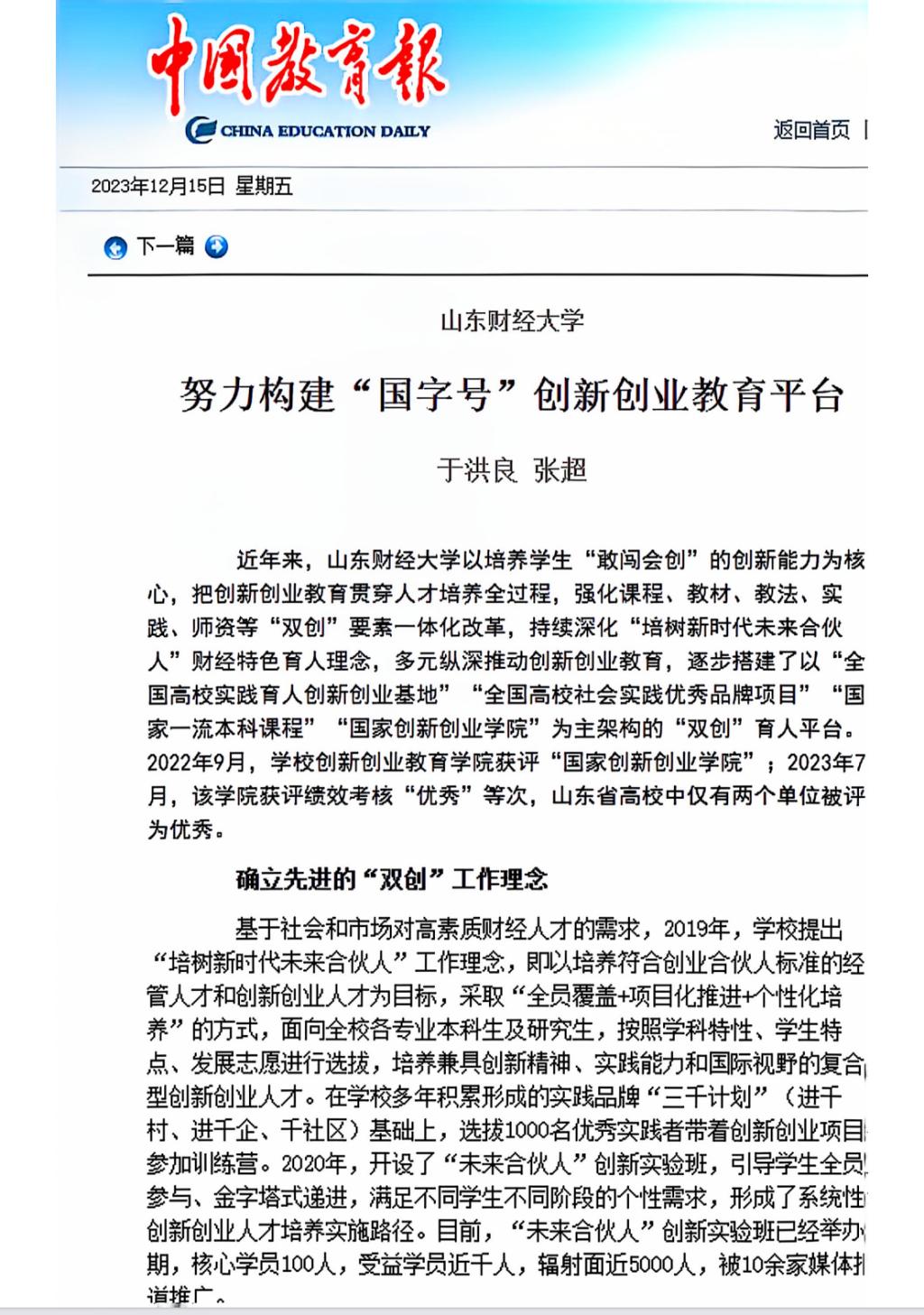 【中国教育报】山东财经大学努力构建国字号创新创业教育平台