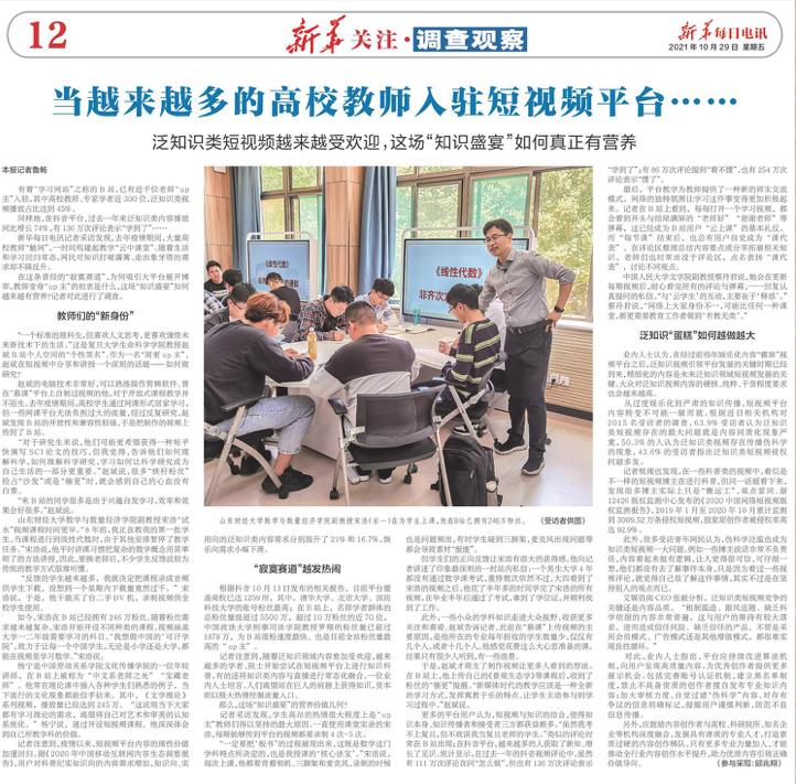 当越来越多的高校教师入住短视频平台,新华每日电讯(新华社),2021 年