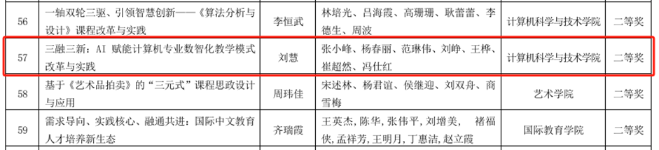 刘慧, 张小峰, 杨春丽, 范琳伟, 刘峥, 王桦, 崔超然, 冯仕红. 三融三新: AI 赋能计算机专业数智化教学模式改革与实践,山东财经大学本科生教学成果奖二等奖, 2024.