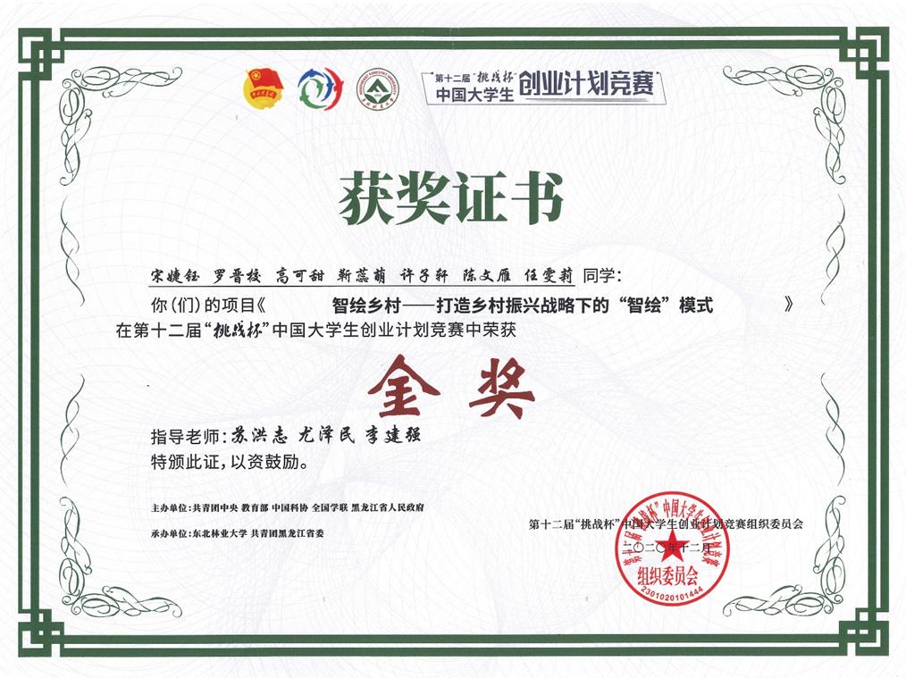 宋婕钰, 罗晋校, 高可甜等. 智绘乡村—打造乡村振兴战略下的“智绘”模式, 第十二届“挑战杯”中国大学生创业计划竞赛, 全国金奖, 2020.
