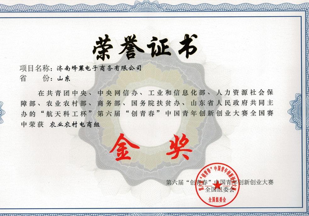 济南蜂菓电子商务有限公司, 第六届“创青春”中国青年创新创业大赛全国赛, 全国金奖, 2019.