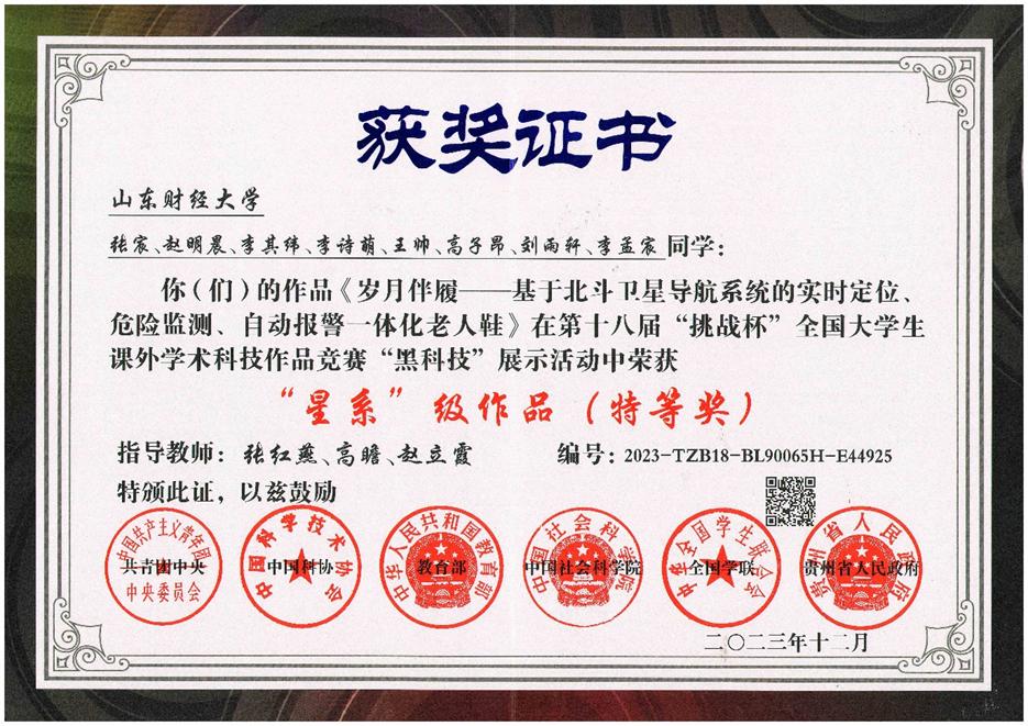 张宸, 张明晨, 李其维等. 基于北斗卫星导航系统的定时定位、危险监测、自动报警一体化老人鞋, “挑战杯”全国大学生课外学术科技作品竞赛“星系”级作品, 全国特等奖, 2023.