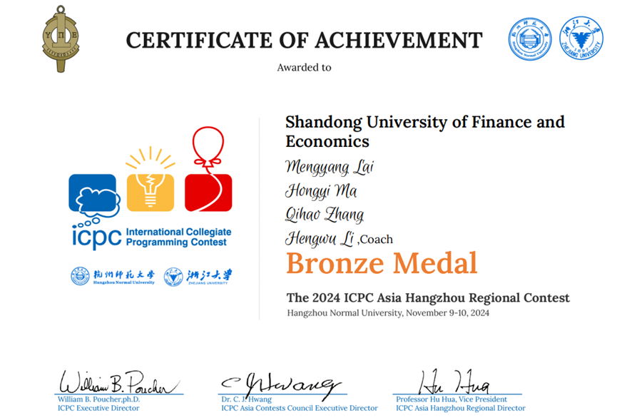 李恒武. 第47届ICPC国际大学生程序设计竞赛亚洲区域赛, 国家级铜牌, 2024.
