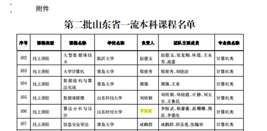 李恒武. 省级一流课程:《算法分析与设计》, 2021.10.1, 山东省教育厅.