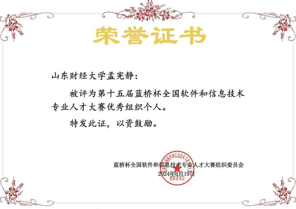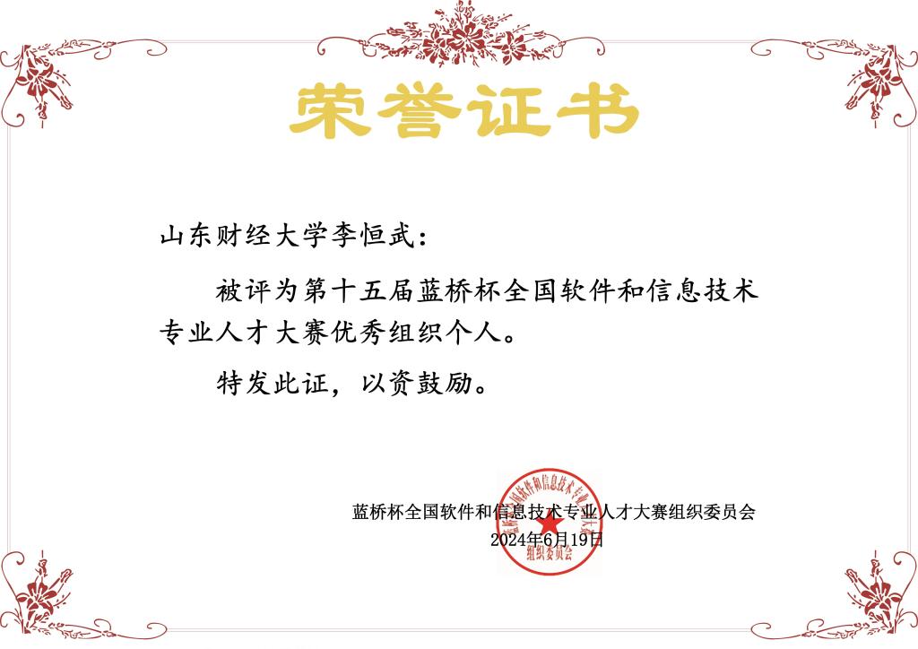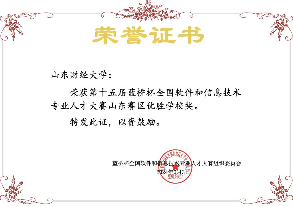 2024年第十五届蓝桥杯大赛国家一等奖1项、二等奖6项、三等奖15项,省级一等奖30项、二等奖66项、三等奖61项,优秀指导教师5人 ,优秀组织个人3人,山东赛区优胜学校奖。