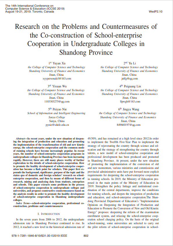 Yuyan Xu, Yu Li, Yixuan Wu, Peiguang Lin, Peiyao Nie, Jingya Wang. Research on the Problems and Countermeasures of the Co-construction of School-enterprise Cooperation in Undergraduate Colleges in Shandong Province[C]. ICCSE 2019, August 19-21,2019. Toronto, Canada