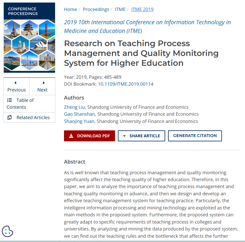 刘铮,高珊珊,袁晓静.Research on Teaching Process Management and Quality Monitoring System for Higher Education,2019 10th International Conference on Information Technology in Medicine and Education (ITME)2019, Pages: 485-489