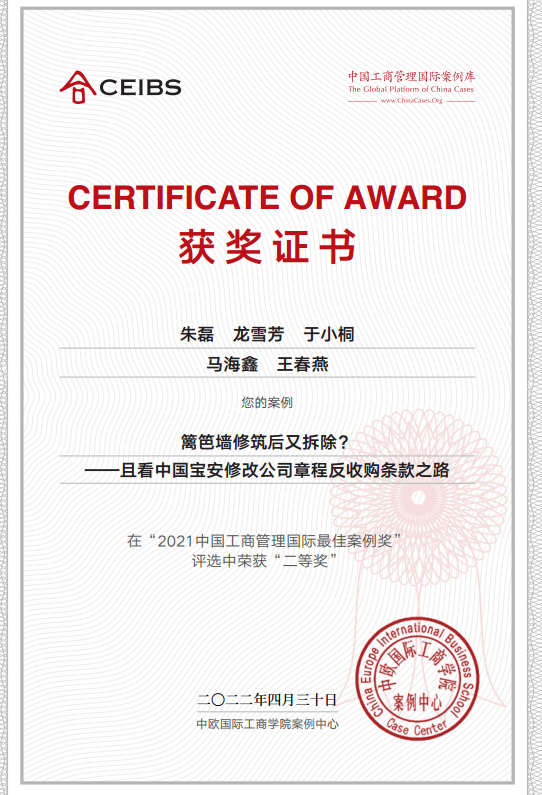 证明材料1:中国工商管理国际最佳案例奖:“篱笆墙修筑后又拆除?——且看中国宝安修改公司章程反收购条款之路